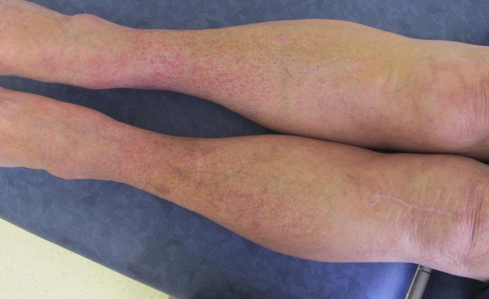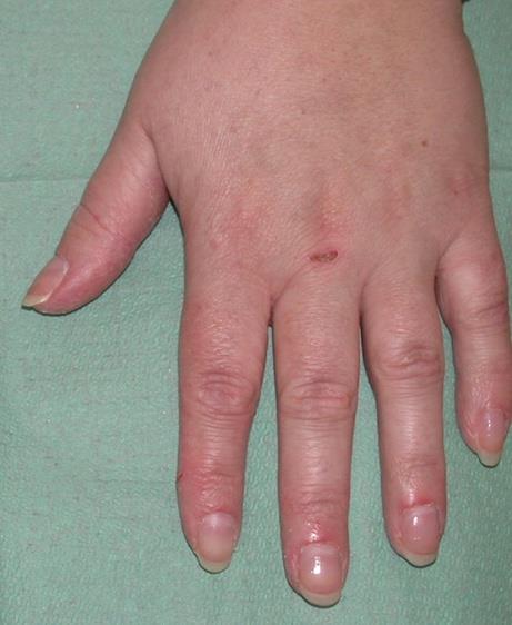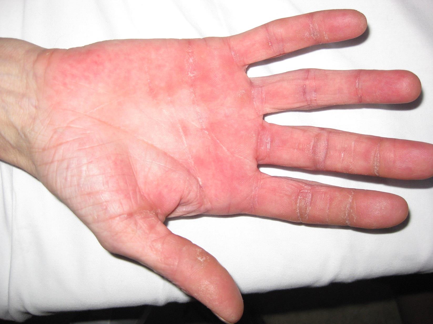 另一类皮肤反应可能发生在手掌和脚底区域,因皮肤红化、冒泡或硬化而经历压力或摩擦
